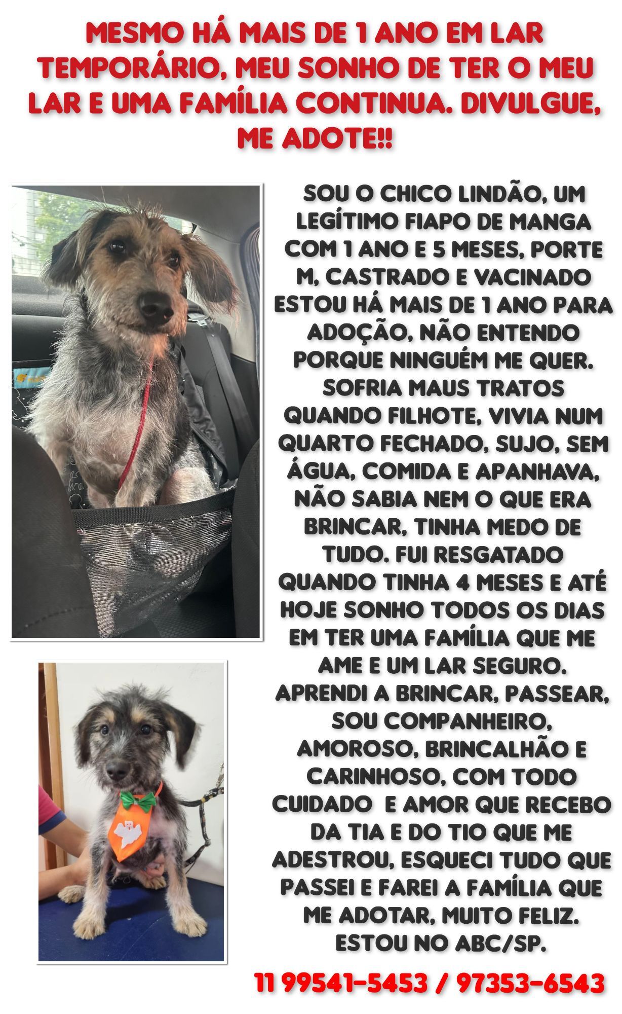 Nosso cão é castrado, vacinado e vermifugado, pronto para conquistar o seu coração. Ele se adapta bem a ambientes com quintal e também se ajusta perfeitamente à vida em apartamento, desde que tenha tempo para brincar e se exercitar. Se você busca um amigo leal e carinhoso, esse é o companheiro que você estava esperando. Venha conhecê-lo e ofereça a ele um lar cheio de amor!